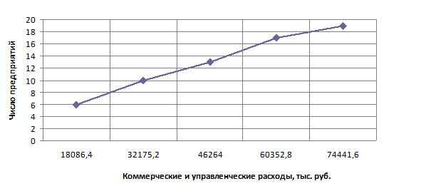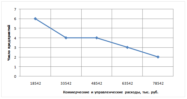 Затем строятся группировки предприятий по остальным признакам, с использованием формул (1.1) и (1.2), и изображаются графически.