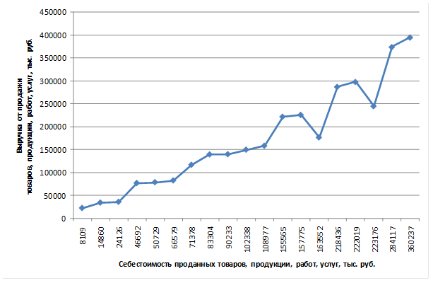 Расчеты показали, что с увеличением себестоимости проданных товаров, продукции, работ, услуг на 1 тыс. руб. и коммерческих, управленческих расходов на 1 тыс. руб. величина выручки от продажи возрастает соответственно в среднем на 1,0054 и 1,0801 тыс. руб.