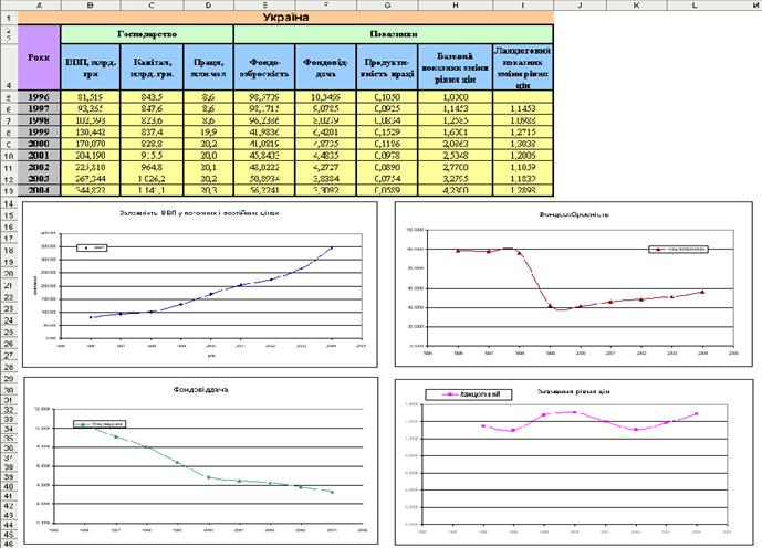 По чотирьом введеним рядам допомогою арифметичних операцій побудовано п'ять нових часових рядів, що визначають показники фондоозброєності, фондовіддачі, продуктивності праці й базові та ланцюгові показники зміни рівня цін у розглянутій господарській системі. Надалі в аналізі беруть участь всі дев'ять рядів.