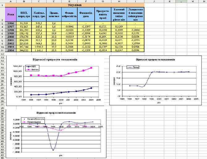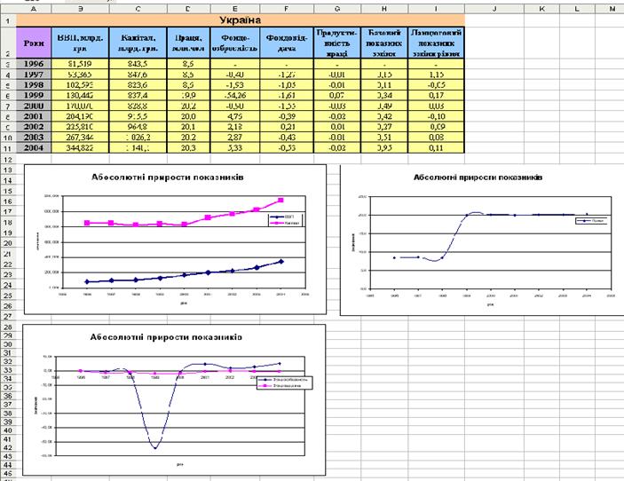 б) Одержання рядів приростів. Для кожного з отриманих рядів розраховано ряди абсолютних і відносних приростів. Ці ряди наведені на двох аркушах: Абс. прирости й Відн. прирости.На цих же аркушах побудовано й відформатовано діаграми з рядами приростів.