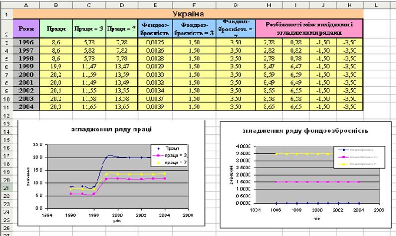 Кожний з рядів піддається згладжуванню методом ковзного середнього при різних варіантах параметрів згладжування. Аналізуються розбіжності між рядами й результатами їхнього згладжування методом ковзного середнього.
