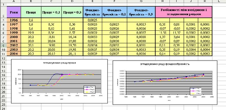 Кожний з рядів піддається експоненціальному згладжуванню при різних варіантах параметрів згладжування. Аналізуються розбіжності між рядами й результатами їхнього експоненціального згладжування. На основі цього методу формуються короткострокові прогнози по кожному з рядів.