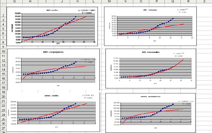 Для кожного з дев'яти рядів проводиться аналіз тенденцій і побудова прогнозу шляхом виявлення аналітичного тренда. Для кожного ряду виведено чотири варіанти лінії тренда (лінійний, степеневий, логарифмічний, експоненціальний) з рівнянням і коефіцієнтом детермінації (коефіцієнтом апроксимації) R2 . Вибрав найбільш прийнятний вид тренда.