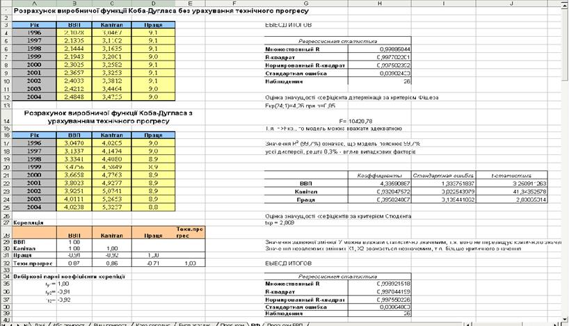 На цьому ж аркуші вказано результати розрахунків виробничої функції з конкретними числовими значеннями параметрів без обліку й з урахуванням технічного прогресу.