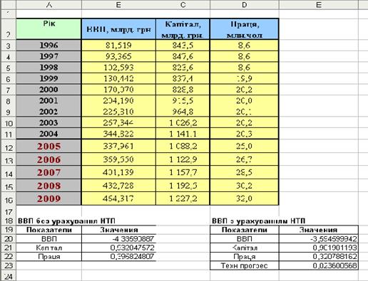Разом з формуванням звичайної виробничої функції на цьому ж аркуші визначено параметри виробничої функції з урахуванням впливу технічного прогресу. Технічний прогрес враховується в моделі в автономній формі, у вигляді множника виду еg t .
