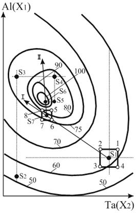Если далее экспериментатор сумеет перейти к другой исходной точке S2 , то, последовательно изменяя содержание алюминия и тантала, он найдет наиболее прочный сплав, однако этот путь будет достаточно длинным (S2 -S3 -S4 -S5 -S6 ).