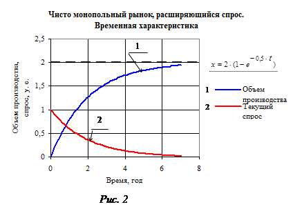 На рис. 2 приведена временная характеристика модели с постоянной времени Т 1 = 2 года (с =1 год−1 ; l= 0,5) и коэффициентом передачи К = 2, представляющая собой зависимость объема производства от времени при входном скачкообразном воздействии (изменении спроса) х вх = 1 у.е.. По временной характеристике можно судить о динамических свойствах объекта. В данном случае по принятой классификации объект– апериодическое звено первого порядка [8] .
