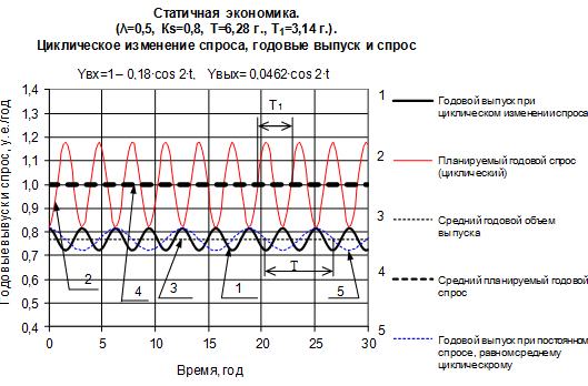 где х вх0 =х 01 = 0 − начальный планируемый спрос,b = 1 у.е./год − средний годовой планируемый спрос, b 1 = 0,09 у.е. − амплитуда цикла спроса, T 5 = 0,5 года – параметр динамики спроса (соответствует периоду цикла спроса Т спроса = Т 1 = 2∙π∙Т 5 = 2∙π 0,5 = 3,14 года),