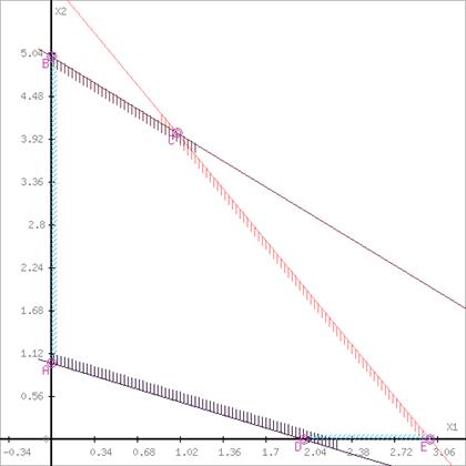 Пряма F(x) = const перетинає область у точці B. Оскільки точка B отримана в результаті перетину прямих 2 i 5, то її координати задовольняють рівнянням цих прямих: