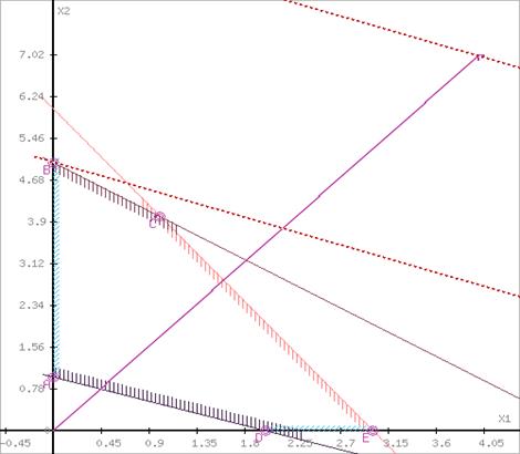 Побудуємо пряму, що відповідає значенню функції F = 0: F = 4X1 +7X2 = 0. Будемо рухати цю пряму паралельним чином. Оскільки нас цікавить максимальне рішення, тому рухався прямо до останнього торкання позначеної області. На графіку ця пряма позначена пунктирною лінією.