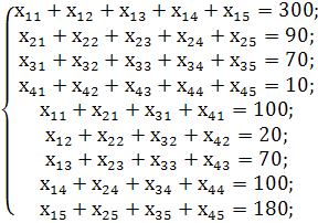 З вантажів хij що стоять в мінусових клітинах, вибираємо найменше, тобто у = min (4, 5) = 10. Додаємо 10 до обсягів вантажів, що стоять в плюсових клітинах і віднімаємо 10 з Хij, що стоять в мінусових клітинах.