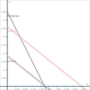 Побудуємо область допустимих рішень, тобто вирішимо графічно систему нерівностей. Для цього побудуємо кожну пряму і визначимо півплощини, задані нерівностями (півплощини позначені штрихом).