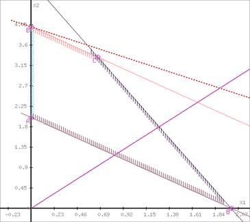 Побудуємо пряму, що відповідає значенню функції F = 0: F = 5X1+7X2 = 0. Будемо рухати цю пряму паралельним чином. Оскільки нас цікавить максимальне рішення, тому рухався прямо до останнього торкання позначеної області. На графіку ця пряма позначена пунктирною лінією.