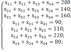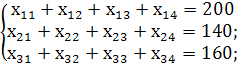Аналогічні обмеження можна записати відносно замовників: вантаж, що може надходити до споживача від чотирьох баз, має повністю задовольняти його попит. Математично це записується так: