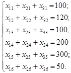 Запишемо умови задачі у вигляді транспортної таблиці та складемо її перший опорний план у цій таблиці методом «північно-західного кута».