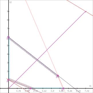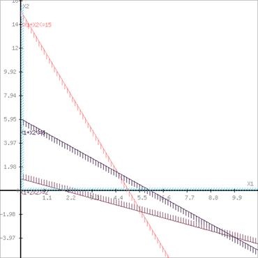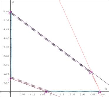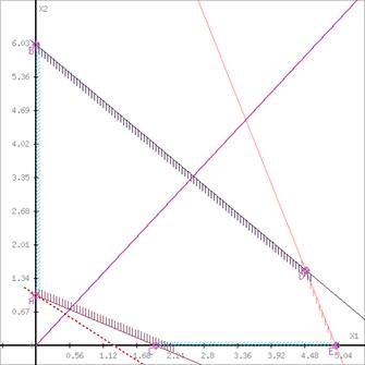 Перетином півплощини буде область, яка представляє собою багатокутник, координати точок якого задовольняють умові нерівностей системи обмежень задачі.Пряма F(x) = const перетинає область у точці A. Оскільки точка A отримана в результаті перетину прямих 2 i 5, то її координати задовольняють рівнянням цих прямих: