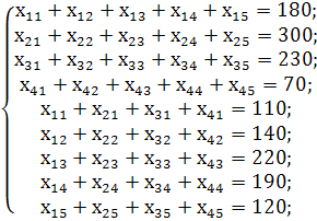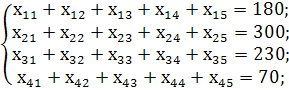 З вантажів хij що стоять в мінусових клітинах, вибираємо найменше, тобто у = min (4;5) = 70.