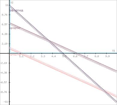Побудуємо область допустимих рішень, тобто вирішимо графічно систему нерівностей. Для цього побудуємо кожну пряму і визначимо півплощини, задані нерівностями (півплощини позначені штрихом).