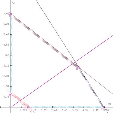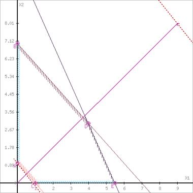 Побудуємо пряму, що відповідає значенню функції F = 0: F = 9X1+8X2 = 0. Будемо рухати цю пряму паралельним чином. Оскільки нас цікавить мінімальне рішення, тому рухався прямо до першого торкання позначеної області. На графіку ця пряма позначена пунктирною лінією.