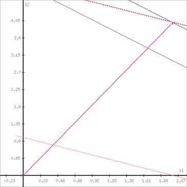 Побудуємо пряму, що відповідає значенню функції F = 0: F = 2X1+4X2 = 0. Будемо рухати цю пряму паралельним чином. Оскільки нас цікавить мінімальне рішення, тому рухався прямо до першого торкання позначеної області. На графіку ця пряма позначена пунктирною лінією.