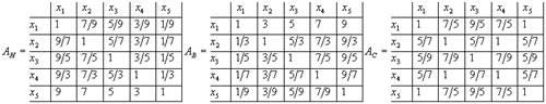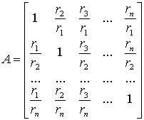 Оценку элемента хі по сравнению с элементом хj с точки зрения свойства А обозначим через аij. Для обеспечения согласованности примем аij = 1/аji. Оценки аij составляют матрицу S = ║аij║.