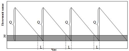 Поточний запас матеріалу, як показано на малюнку 1.1 змінюється по "пилці" і, при його зниженні до рівня R (крапка замовлення), розмішається повторне замовлення. Замовлені вироби будуть отримані через інтервал часу L, що у даній моделі залишається незмінним.