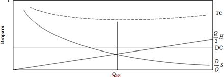 DC у правій частині рівняння являє собою Вартість закупівлі річної потреби матеріалу; (D/Q)S - річні витрати на розміщення замовлень (фактична кількість розміщених замовлень D/Q, помножена на витрати на розміщення одного замовлення S), а (Q/2)H - річні витрати зберігання (середній запас Q/2, помножений на річні витрати зберігання одного виробу Н). Залежності між цими величинами представлені в графічному виді на мал. 1.2.