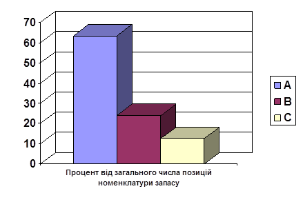 Рис. 3.2 - Залежність внеску кожної групи в загальну Вартість запасу товарів від частки відповідної групи в загальній номенклатурі