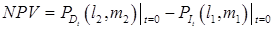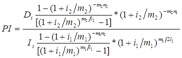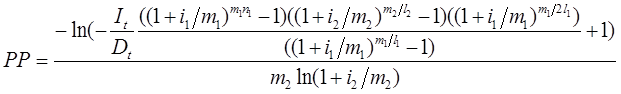 l1 , l2 – количество платежей в году для периода инвестиций и доходов соответственно;