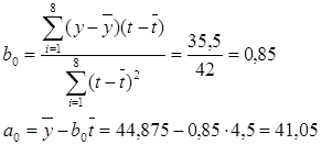 Для оценки начальных значений a0 и b0 применим линейную модель к первым 8-ми значениям заданного ряда (табл. 1.2.)
