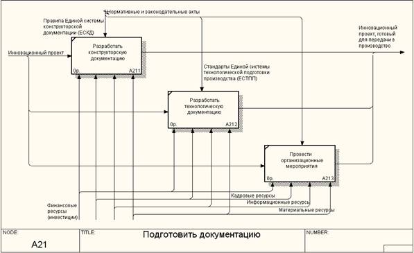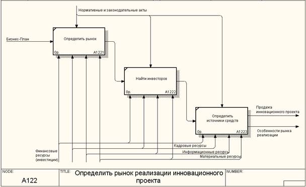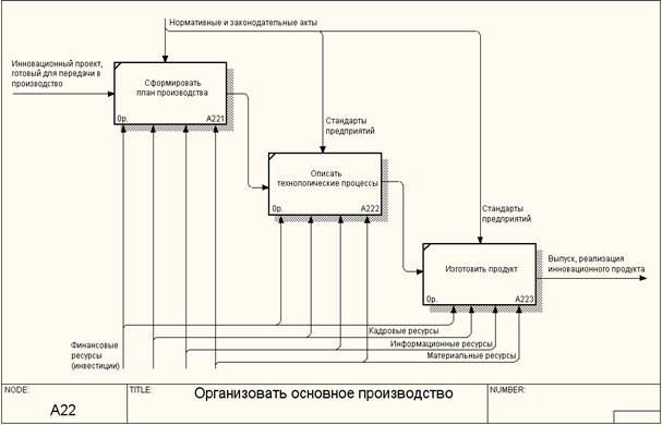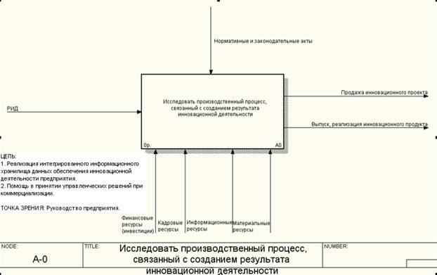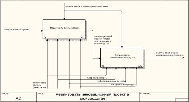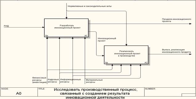 На основе результатов инновационной деятельности (РИД) начинается производственный процесс, связанный с созданием результата инновационной деятельности. Процесс управляется нормативными и законодательными актами. Выполняется процесс с помощью финансовых, кадровых, информационных и материальных ресурсов. На выходе процесса имеем продажу инновационного проекта, а также выпуск, реализацию инновационного продукта.