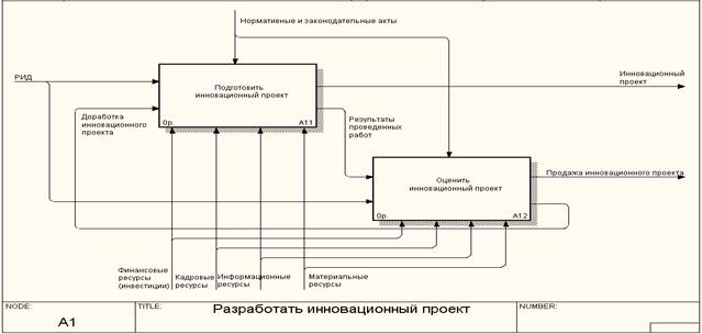 1. При поступлении информации о РИД запускается функция разработки инновационного проекта. Управляющими воздействиями для функции являются нормативные и законодательные акты. Инструментами являются финансовые, кадровые, информационные и материальные ресурсы. На выходе получаем продажу инновационного проекта и сам инновационный проект.