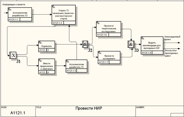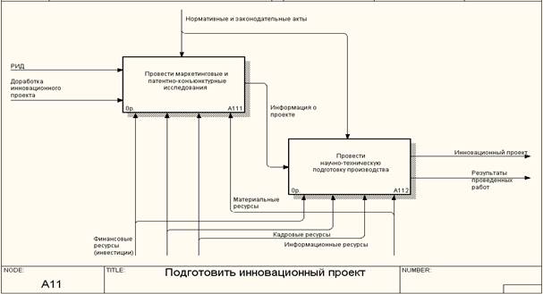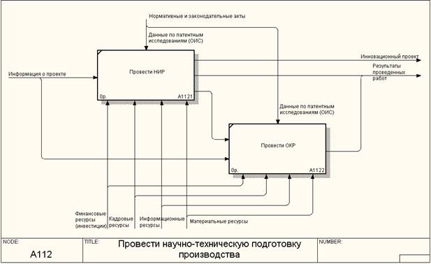 При поступлении информации о проекте запускаются функции проведения НИР и ОКР. Управляющими воздействиями для функции являются нормативные и законодательные акты (данные по патентным исследованиям – ОИС). Инструментами являются финансовые, кадровые, информационные и материальные ресурсы. На выходе получаем инновационный проект и результаты проведенных работ.