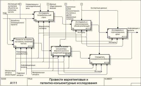 1. При поступлении информации о РИД запускается функция проведения маркетинговых и патентно-конъюнктурных исследований. Управляющими воздействиями для функции являются нормативные и законодательные акты. Инструментами являются финансовые, кадровые, информационные и материальные ресурсы. На выходе получаем информацию о проекте.