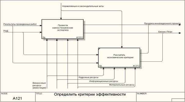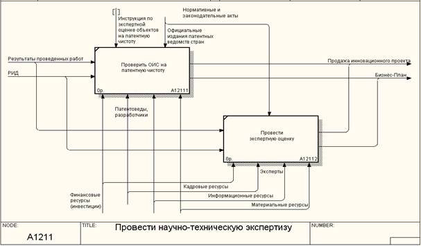 При поступлении информации о РИД и результатах проведенных работ запускаются функции проведения научно-технической экспертизы и расчета экономических критериев. Управляющими воздействиями для функции являются нормативные и законодательные акты. Инструментами являются финансовые, кадровые, информационные и материальные ресурсы. На выходе получаем продажу инновационного проекта и бизнес-план.
