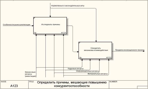 3. При поступлении особенностей рынка реализации на вход запускается функция определения причин, мешающих повышению конкурентоспособности. На выходе получаем продажу инновационного проекта.