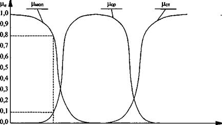 Будущее развития теории шкалирования и ее применения для нужд математического обеспечения ИС связаны с дальнейшим развитием понятия измерения. Наиболее перспективным представляется расширение понимания шкалы путем привлечения понятий нечеткой и лингвистических переменных, используемых в теории нечетких множеств. Обобщение понятия характеристической функции путем перехода к понятию функции принадлежности μn € [0,1], используемой в этой теории, создает базу для введения более тонкой структуры измерения качественных характеристик и учета неопределенностей, свойственных сложным системам, на основе понятия нечеткой шкалы. Например, пусть рассматриваемое нечеткое множество возраст людей. Нечеткими переменными (шкальными значениями), означающими возраст, являются лингвистические переменные «молодой», «средний», «старый» с приписанными им функциями принадлежности, которые можно определить так, как показано на (рис. 2.) При этом 20-летний человек относится к нечеткому подмножеству возраста «молодой» с функцией принадлежности μмол = 0,8, и он же с функцией принадлежности μср = 0,1 относится к нечеткому подмножеству возраста «средний». Рис. 2. Пример нечеткой шкалы. (смотреть Приложение 4.)