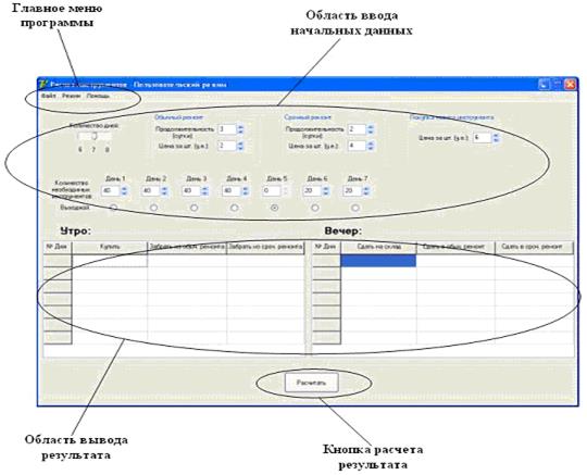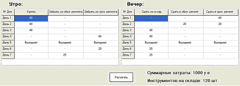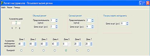 Данная программа предназначена для расчета графика ремонта и покупки инструмента, чтобы при минимальных издержках обеспечить предприятие инструментом в течении 6,7 или 8 последовательных дней. Входными данными для программы являются: стоимость покупки нового инструмента (5,6,7 у.е.), срок и цена обычного ремонта ( 2, 3, 4 дня за 1, 2, 3 у.е соответственно), срок и цена срочного ремонта ( 1, 2, 3 дня за 3, 4, 5 у.е соответственно), а также количество инструментов, требуемых утром каждого дня (от 15 до 45 инструментов) и номер выходного дня, в которые как производство так и ремонтные службы не работают.