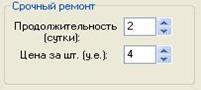 Для того чтобы задать продолжительность и стоимость срочного ремонта, на соответствующей панели области ввода данных нажимайте с помощью мыши на стрелочки "вверх" или "вниз" в зависимости от того хотите вы увеличить или уменьшить количество дней/стоимость.
