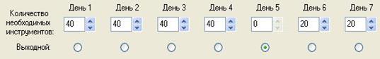 Для того чтобы задать количество инструментов, требуемых на каждый день, в области ввода данных нажимайте с помощью мыши на стрелочки "вверх" или "вниз" требуемого дня в зависимости от того хотите вы увеличить или уменьшить количество инструментов. Под каждым полем ввода количества инструментов можно поставить с помощью щелчка мыши пометку, что именно этот день будет являться выходным. На иллюстрации ниже 5ый день отмечен как выходной.