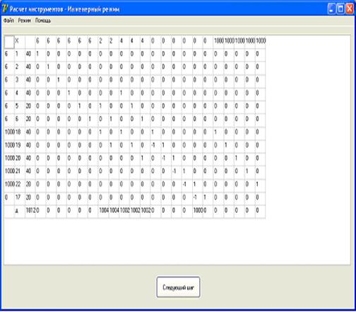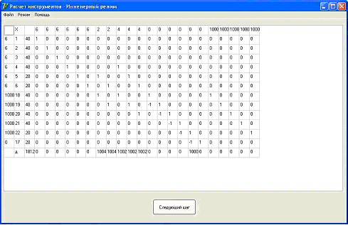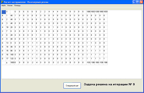 В данном режиме отображается симплекс-таблица, в которой находятся введенные на главной форме данные. При нажатии на кнопку "Следующий шаг" производится переход на следующую итерацию решения.