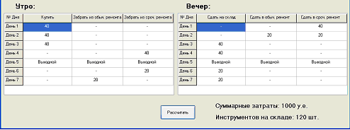 В результате работы программы будет составлен график оптимального ремонта и покупки инструмента, представленный в виде двух таблиц (утро и вечер каждого дня).