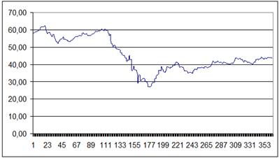 Исходные данные представлены в приложении 1 в виде таблицы. На рис. 1 показано изменение курса акций BritishPetroleum за период с 1 января 2010 года по 31 декабря 2010 года.