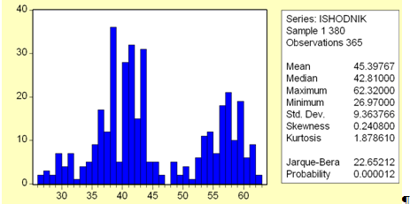 По полученной гистограмме, не похожей на колокол, и статистическим показателям видно (рис. 2), что данные распределены не по нормальному закону: куртозис равен 1,87, что существенно меньше трёх. Поскольку закон распределения отличен от нормального, для проверки гипотезы о стационарности ряда провести параметрические тесты нельзя, и придётся ограничиться непараметрическими тестами.