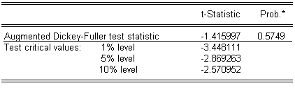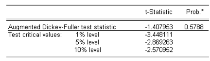 Расчётное значение равно -1,407953. Все приведённые в таблице 1 критические значения меньше расчётного. Это значит, что нельзя отклонить гипотезу о том, что рассматриваемый процесс имеет характер случайного блуждания.
