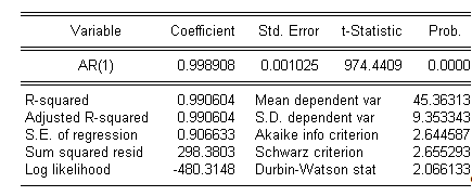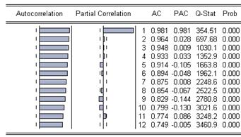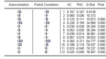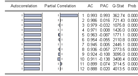 равен 0,998908, то есть почти единице. Данное обстоятельство является свидетельством того, что процесс может носить характер случайного блуждания, что подтверждают результаты теста Дики – Фуллера.