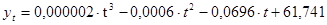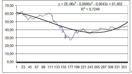, коэффициент детерминации равен 68,77%, то есть полином второй степени описывает 68,77% изменчивости процесса). Коэффициент детерминации равен 72,49%, то есть полиномом третьей степени описано 72,49% изменчивости процесса во времени. На рис. 3 представлен график, демонстрирующий соответствие полинома третьей степени изменчивости процесса во времени: