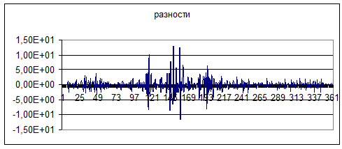 Как видно на графике (рис. 3), значения третьих конечных разностей колеблются около нуля. Наибольшие отклонения значений от нуля наблюдаются ближе к середине рассматриваемого периода, но в его начале и конце они малы и примерно одинаковы. Вероятно, математическое ожидание полученного ряда окажется постоянным, а о постоянстве дисперсии по графику судить сложно.