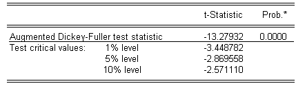 Статистика Дики–Фуллера равна -13,27932. Все приведённые в таблице критические значения больше расчётного, максимальный уровень значимости, при котором можно отклонить гипотезу случайного блуждания – 0, поэтому гипотеза о наличии у процесса характера случайного блуждания отклоняется.