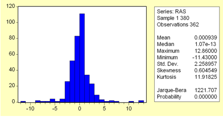Как видно из гистограммы, имеющей более вытянутую по вертикали форму, чем характерная для нормального распределения, и статистических показателей (рис. 5), распределение полученного ряда отлично от нормального: хотя коэффициент асимметрии равен 0,6, что близко к нулю и говорит о симметричности распределения относительно среднего значения, куртозис равен 11,918, что существенно больше трёх. Поскольку закон распределения не является нормальным, для проверки гипотезы о стационарности полученного ряда параметрические тесты неприменимы, и необходимо провести непараметрические тесты.